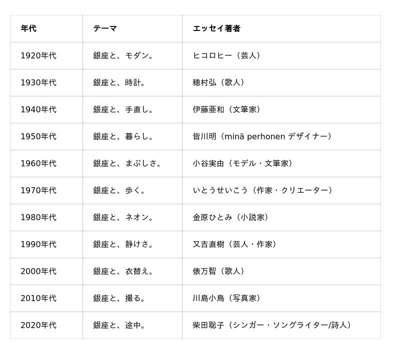 本プログラムは、時代を映す街「銀座」の100年の移り変わりを10年刻みで、「銀座と、モダン。」「銀座と、まぶしさ。」「銀座と、衣替え。」といった年代ごとのムードとして再定義し、これらのキーワードをもとに、ヒコロヒー(芸人)、皆川明(mina perhonen デザイナー)、いとうせいこう(作家・クリエーター)、又吉直樹(芸人・作家)、俵万智(歌人)、川嶋小鳥(写真家)、柴田聡子(シンガー・ソングライター/詩人)など個性豊かな11人の作家/アーティストが書き下ろしたエッセイや詩、小説を立体展示します。そしてこの銀座の100年に、ソニー創立からの80年とソニービル開業からの60年の象徴的なトピックスが重なり合い、各年代の空気感が緩やかにつながる、まるでプロムナードのような空間で、Ginza Sony Park ならではのユニークな歴史の散策を体感いただけます。