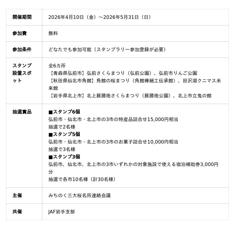 一般社団法人日本自動車連盟(JAF)岩手支部(支部長 千葉 泰)は、2026年4月10日(金)から5月31日(日)にかけて開催される「みちのく三大桜名所を巡るスタンプラリー」(主催:弘前市、仙北市、北上市)に協力します。