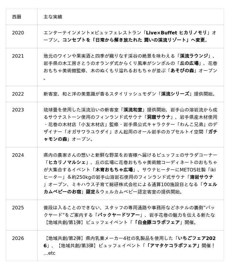 湯の杜 ホテル志戸平「日常からの解放」をコンセプトに、渓流リゾートホテルを通じた非日常への体験価値提供を行っている宿泊施設。2020年のビュッフェレストラン「Live×Buffet ヒカリノモリ」新設以降、様々な改装を重ね、お客様へ岩手花巻の魅力を伝えると共に感動提供にチャレンジしています。