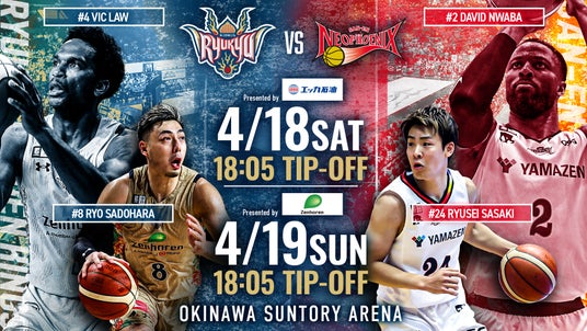 4月18日(土),19日(日)は、三遠ネオフェニックスを沖縄サントリーアリーナへ迎えてのホーム戦です。1勝1敗のタイとなった11月のアウェー戦以来、約5ヶ月を経たこの最終盤での再戦は白熱必至です。