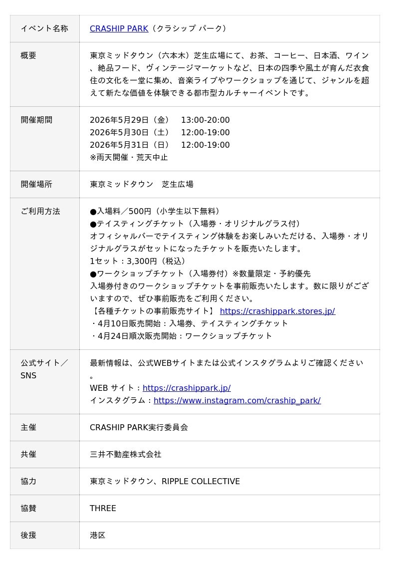 三井不動産株式会社(代表取締役社長 植田 俊、以下「三井不動産」)およびCRASHIP PARK実行委員会は、2026年5月29日(金)~5月31日(日)の3日間、東京ミッドタウン(六本木)で開催する 『MIDTOWN OPEN THE PARK 2026』 において、ジャンルを超えた日本の“ものづくり”を体験する『CRASHIP PARK(クラシップ パーク)』を開催いたします。同イベントでは、お茶、コーヒー、日本酒、ワインの他、絶品フード、クラフト&ヴィンテージまで、ジャンルを越えた日本各地の衣食住の文化が一堂に集結。