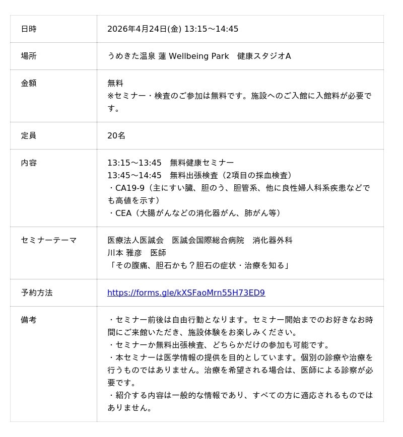 「うめきた温泉 蓮 Wellbeing Park」(総支配人:藤立 達哉、所在地:大阪市)は、2026年4月24日に、提携医療機関である医療法人医誠会(代表者:谷 幸治、本社:大阪市)の「医誠会国際総合病院」と共同で、第12回健康セミナーを開催することをお知らせします。