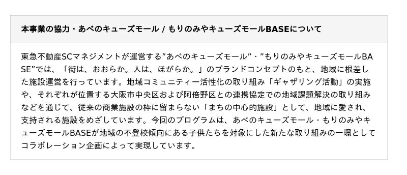 文部科学省の調査等でも、長期休暇明けや新学期など生活環境が大きく変化する時期には、子どもが学校に対する不安や“行きづらさ”を感じやすく、不登校に関する相談が増える傾向が指摘されています。報道関係者の皆様におかれましては、そういった時期にひとつの選択肢として本プロジェクトの存在を多くの方に届けるため、取材や記事掲載のご協力をお願い致します。