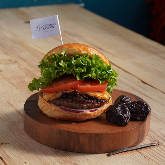 - カリフォルニアプルーンと豚肉のバーガー(左)