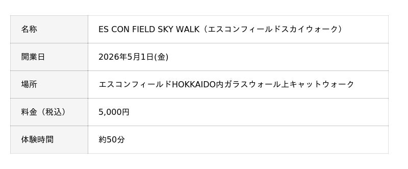 株式会社ファイターズ スポーツ&エンターテイメントでは、エスコンフィールドHOKKAIDO(以下「エスコンフィールド」)において、新たなエンターテイメント体験として、球場最上部を歩くキャットウォークツアー「ES CON FIELD SKY WALK(エスコンフィールドスカイウォーク)」を開業いたします。