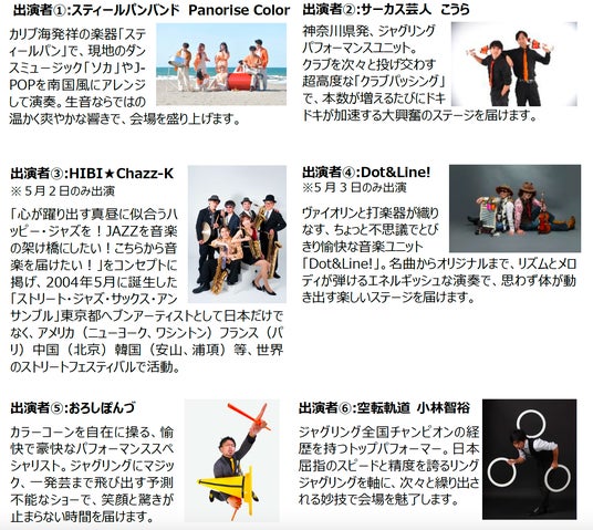 ・天候(雨天等)の影響により、予告なくパフォーマンスを中止または内容を変更する場合がございます。
