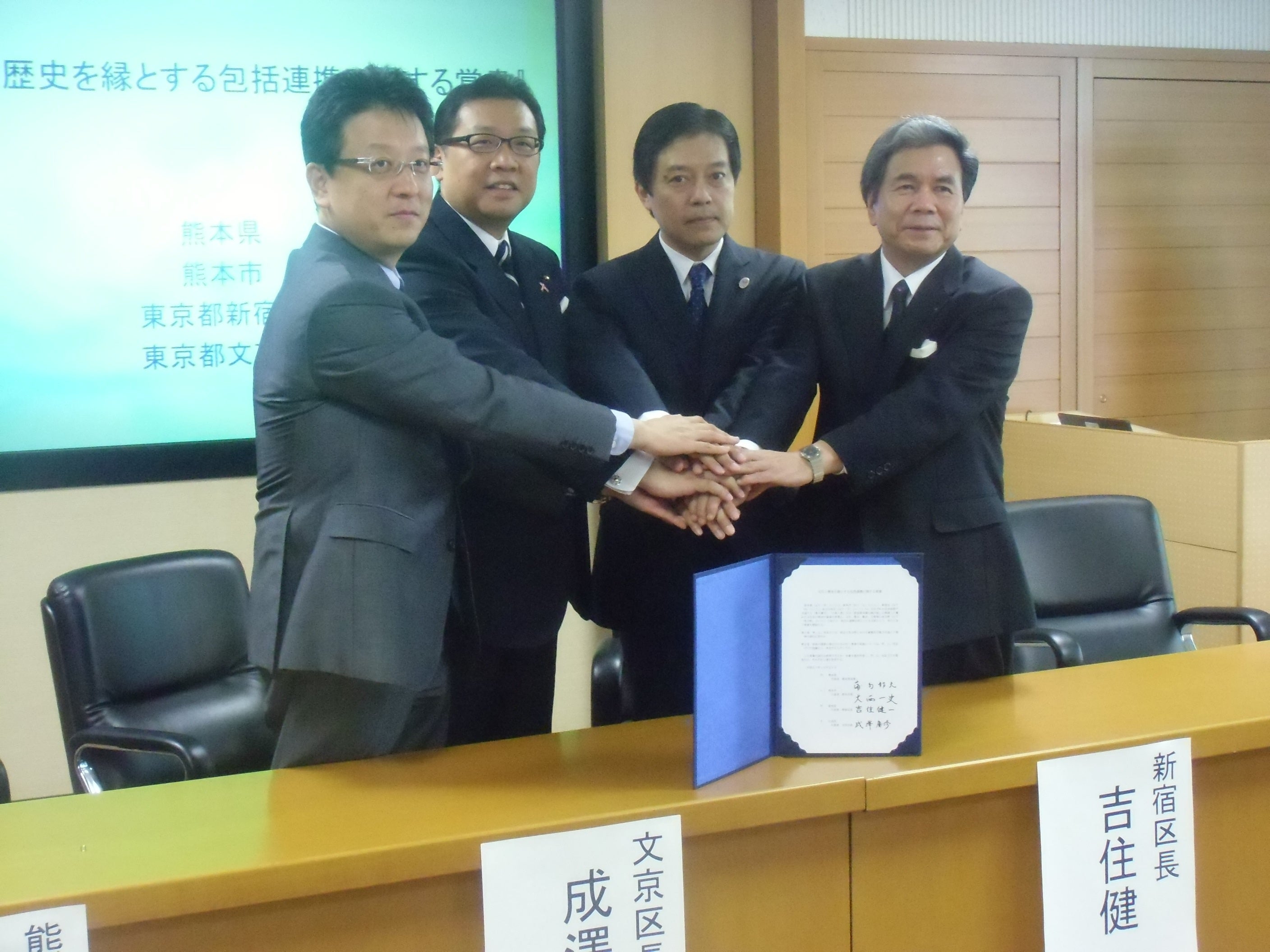 新宿区に縁のある夏目漱石や小泉八雲が現在の熊本大学で教鞭を執ったという深い文化的・歴史的背景を共有しています。この「文豪の縁」を礎に、平成27年(2015年)には熊本県、熊本市、新宿区、文京区の四者間で「文化と歴史を縁とする包括連携に関する覚書」を締結しました。この連携は単なる形式に留まらず、各自治体が持つ文化施設や歴史的資源を相互に活用した交流を継続しています。令和7年(2025年)11月には、締結10周年の節目として記念事業を開催。自治体の垣根を越えたトップ同士の対話を通じて、これまでの歩みを再確認するとともに、文化を基軸とした地域活性化と次世代への継承に向けた新たな一歩を踏み出しています。