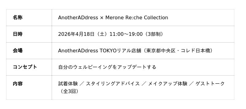 女性の自立とウェルビーイングを支援する株式会社Merone(所在地:東京都渋谷区、代表取締役:森川公美子、以下「Merone」)は、株式会社大丸松坂屋百貨店が運営するファッションサブスクリプションサービス「AnotherADdress(アナザーアドレス)」と共同で、2026年4月18日(土)、コレド日本橋のAnotherADdress TOKYOリアル店舗にて、女性のウェルビーイングをテーマにした体験イベント「AnotherADdress Merone Re:che Collection」を開催いたします。