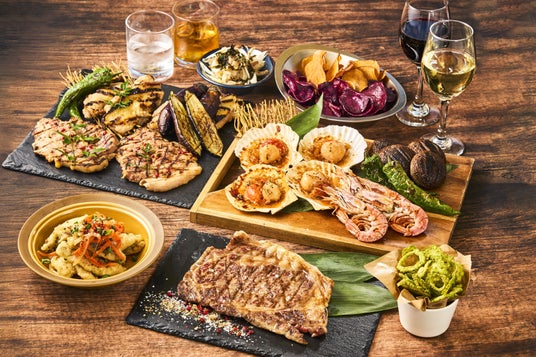 九州産黒毛和牛ステーキや赤海老の香草マリネなど、和牛と海鮮を堪能する上質なBBQプラン。豚ロースの西京漬けやホタテの和風だし醤油、ゴーヤ&紅イモチップスなど、こだわりの素材をじっくりと味わえる内容。