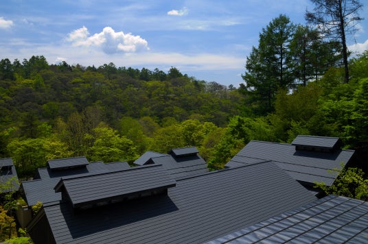 星のや軽井沢の客室には、屋根の上に「風楼(ふうろう)」と呼ばれる小屋根を設けています。これは天井部から外気を取り込む通気口の役割を担うもので、温まった空気を排出し、冷涼な外気を呼び込むことで室内の空気循環を促す仕組みです。自然の風の流れを活かして室温を調整する「天然のエアコン」としての機能を備え、空調設備に過度に頼ることなく、心地よい空間を維持することを目指した建築設計です。
