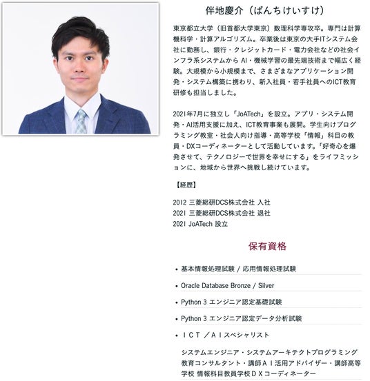大手ITシステム会社を経て独立し、アプリ開発・AI活用支援に加え、ICT教育事業を展開。高等学校の「情報」科目の教員や学校DXコーディネーターとしても活動し、未経験者がつまずきやすいポイントを丁寧にサポートします。