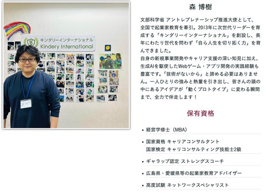 一般社団法人子供教育創造機構「自ら問いを立て、自ら行動し、自ら変化を起こす」お子さんの育成を目指し、学童保育型アントレプレナーシップ育成スクール「キンダリーインターナショナル」を運営。