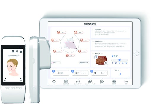 ハンディタイプの肌測定デバイス「スキンカウンセルV」で測定し、コスメデコルテが研究を重ねてきた肌データに基づいて肌状態を解析。蓄積したデータから年代平均と比較でき、客観的な肌状態をお客さまにも共有。測定結果に応じてファンデーションの色選びためのガイドマップも表示され、ベースメイクの色選びに活用できます。