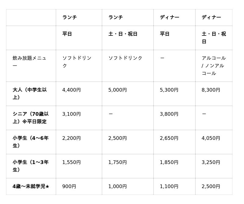 【提供時間】 11:00~15:00《90分制 / 4部制》 / 17:30~21:30《2時間制》※土日祝は17:00~