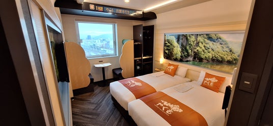 客室数は2部屋「500系新幹線の再現・そのままの体験」をテーマとして、それぞれ往年と現在の異なる設定でご用意しました。室内だけではなく廊下にも500系新幹線のデザインを取り入れ、アプローチを含めて楽しめるデザインになっています。また、室内の一部には試験車両のデザインもあしらい、過去も含めた500系の歴史を感じて頂けるよう表現しています。