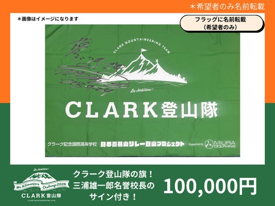 三浦雄一郎名誉校長のサイン付き! クラーク登山隊の旗登山隊が100名山を登頂するたびに持って行った旗のうち1枚をさしあげます。そこには登山家であり冒険家でもある三浦雄一郎校長のサイン入り!ぜひみなさんの登山のお供にしてください!