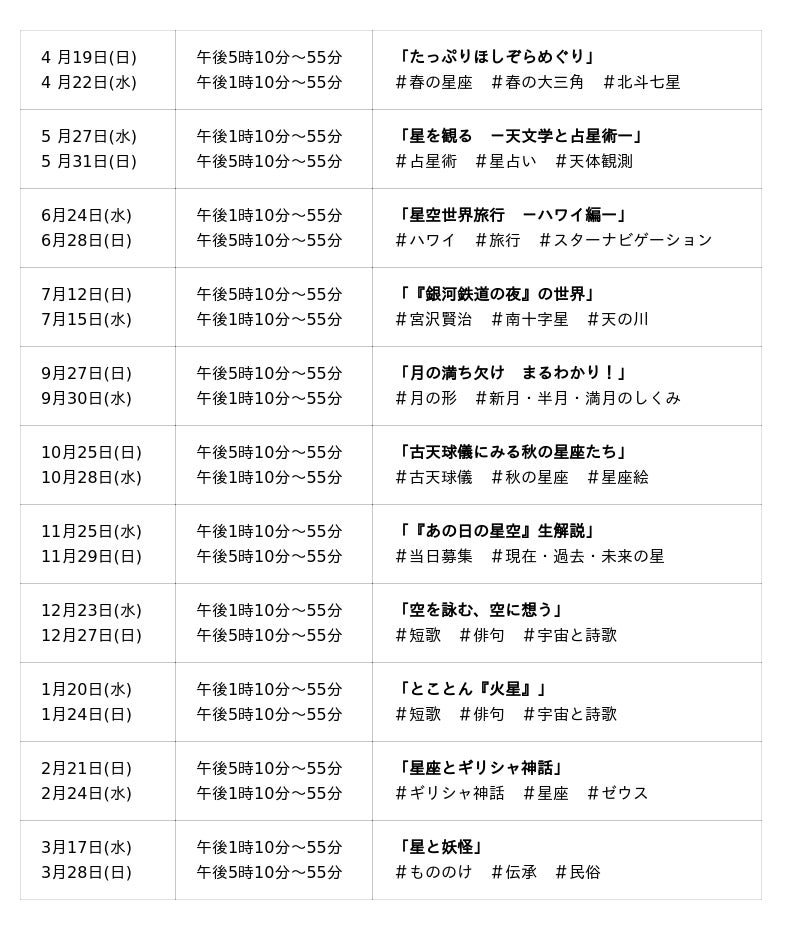科学に限らず文化やアートなど様々な視点から星空を語るこの特別なプログラムは、当館の天文グループの解説員自ら制作から担当するため、他では観ることのできない番組となっています。このたび、その2026年度の年間スケジュールが決定しました。
