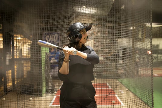 ハイテク・バッティング体験東京ドームシティ内の屋内型スポーツ施設 スポドリ!にて、投手映像が映し出されるスクリーン式バッティングコーナーを体験