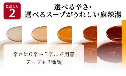 スープは、定番の麻辣湯に加え、白湯系やトマトベースなど全4種類を用意。辛さは0辛~5辛まで選択可能で、辛いものが苦手な方から本格志向の方まで幅広く楽しめます。