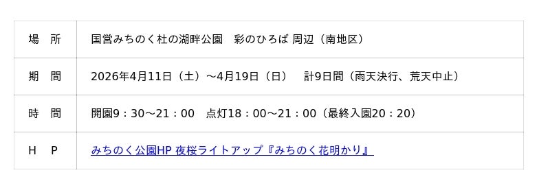みちのく公園では、約600本のソメイヨシノをはじめ、ヤマザクラ、サトザクラ、シダレザクラなど合計約1400本のサクラが開花しています。今年で4回目となる同イベントは、大花壇がある「彩のひろば」というエリアを会場に、周囲約1000mを囲む100本のソメイヨシノなどを大小さまざまなLEDライトで照らし、総延長約1200mのチューブライトなどでライトアップ。今回は新たにムービングライトを導入、白色の光が動いていく演出(外部リンク:公式Instagram)も行っています。