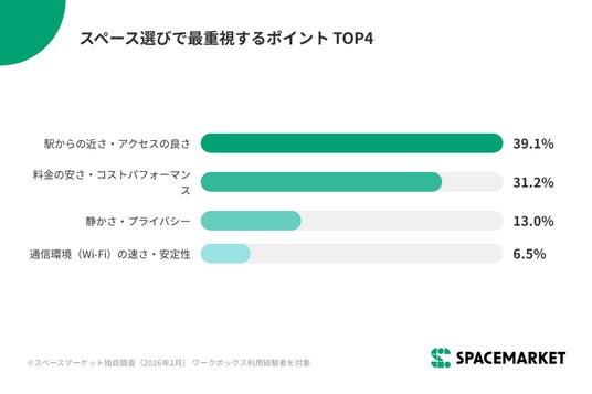 スペースを探す際に最も重視するポイントは「駅からの近さ・アクセスの良さ」(39.1%)が1位、次いで「料金の安さ・コストパフォーマンス」(31.2%)となりました。移動効率を最大化できる立地にあることが、ワークボックス選びの最大の基準となっています。また、Wi-Fi環境(6.5%)についても4位にあがっており、速度品質も重視されていることがわかります。