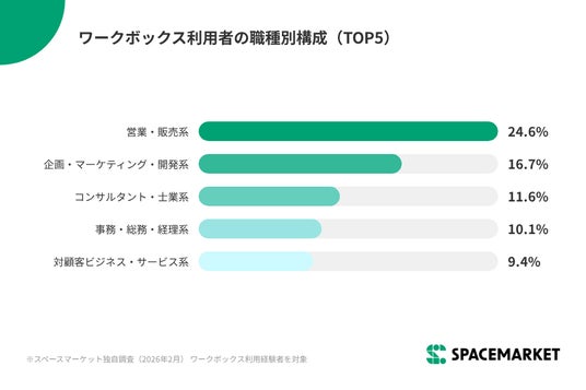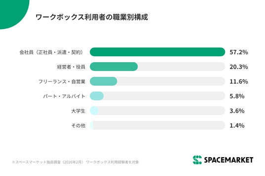 ワークボックス利用者の職業は、会社員(正社員・派遣・契約社員)が約57%を占め、経営者・役員を含めると約77.5%が組織に属しています。職種別では営業・販売系(24.6%)が最も多く、外出や打ち合わせが多い職種に支持されています。一方で、大学生の利用もあり、就職活動における面談・面接の場としても活用が広がっています。