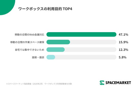 利用目的の47.1%が「移動時間の間にWeb会議が入り、オンラインで話せる場所が必要だった」と回答。外出先や移動中に、周囲の目を気にせず安定した通信環境でWeb会議や商談を行うセーフティネットとして機能していることがわかりました。また「移動の合間」需要以外にも、自宅に家族がいて集中できない場合(12.3%)や、採用面接・転職面談など秘匿性が高い用途(5.8%)での利用も確認されています。