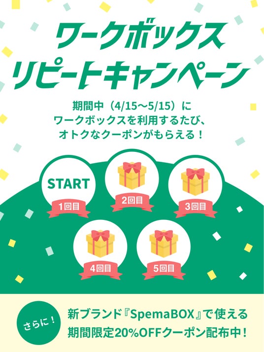 期間中にワークボックスを利用するたびにお得なクーポンがもらえます。移動の合間のWeb会議や、PC作業、休憩にもお使いいただけます。