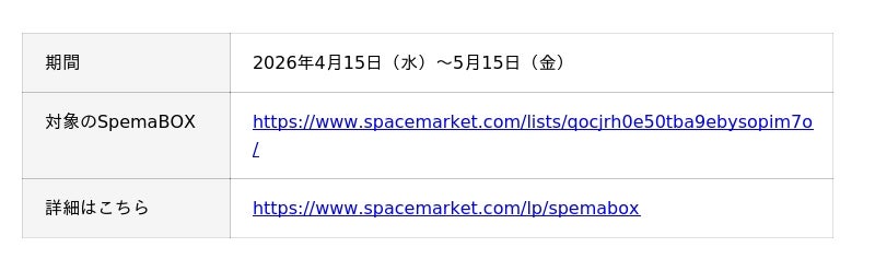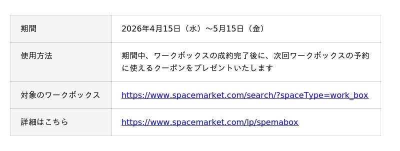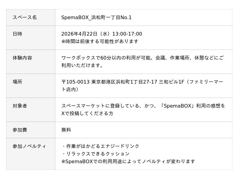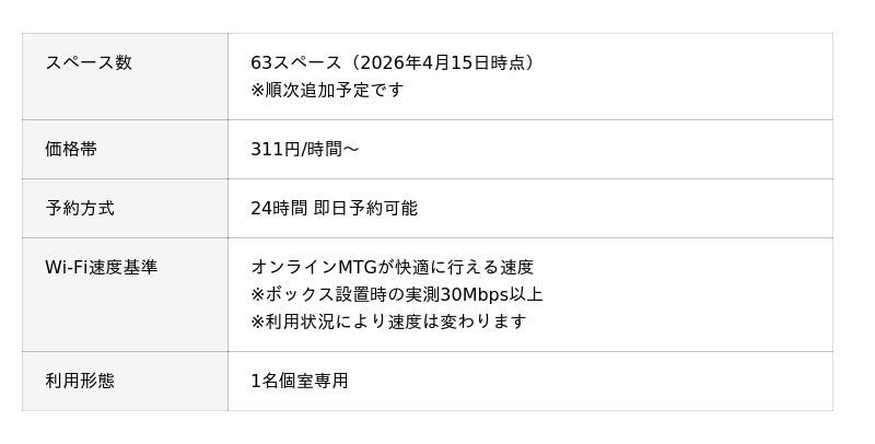 あらゆる場所で新しい定番体験を生み出すマーケットプレイス「スペースマーケット」を運営する株式会社スペースマーケット(本社:東京都渋谷区、代表取締役社長:重松大輔、以下、スペースマーケット)は、ワークボックスの新ブランド「SpemaBOX(スペマボックス)」を2026年4月15日より全国63台でローンチいたします。ハイブリッドワークの定着により、外出先や移動中でも安心してWeb会議や作業ができる個室空間へのニーズが高まる中、Wi-Fi速度や駅近立地などの独自の基準を満たしたワークボックスです。