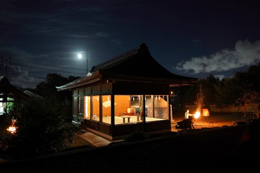 夜の境内の空気を感じながら開演を待ちます。昼間とは異なる静けさが、これから始まる神事芸能へ向けて気持ちを整えてくれます。