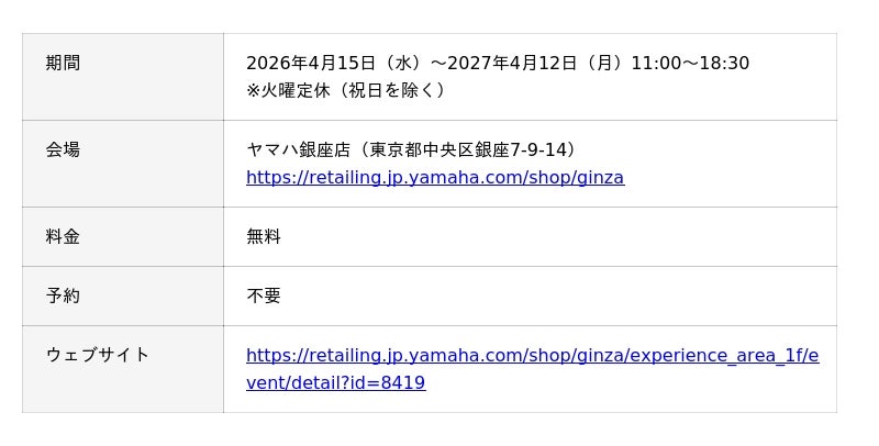 ヤマハ株式会社(以下、当社)は、アコースティックピアノの魅力とともに、当社が長年にわたり培ってきたピアノづくりの伝統と技術を紹介する企画展示を、2026年4月15日(水)から2027年4月12日(月)まで、旗艦店であるヤマハ銀座店(東京都中央区銀座7-9-14)1階のブランド体験エリアにて開催します。