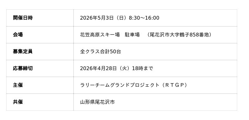 JAF(一般社団法人日本自動車連盟)山形支部(支部長 鈴木 政康)は、5月3日(日)に山形県尾花沢市の花笠高原スキー場駐車場で開催される「オートテストチャレンジin尾花沢2026」(主催:ラリーチームグランドプロジェクト)にPR活動などで協力します。