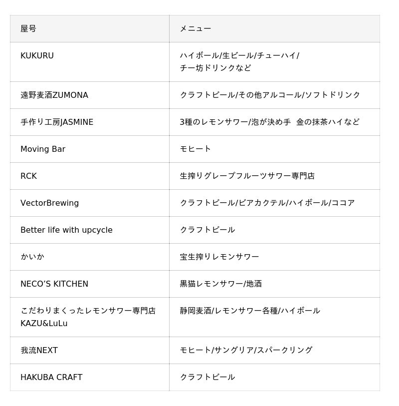 このほか、岩手・遠野のクラフトビール「遠野麦酒ZUMONA」、生搾りグレープフルーツサワー専門店「RCK」、オリジナル本格モヒート「Moving Bar」、「こだわりまくったレモンサワー専門店 KAZU&LuLu」など、全10店舗以上のお酒ブースが集結。