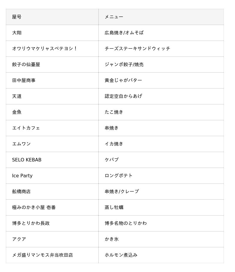 このほか、お好み焼き「大翔」、ロングポテト「Ice Party」、蒸し牡蠣「極みのかき小屋 壱番」、からあげ「天道」、ケバブ「SELO KEBAB」、かき氷「アクア」、クレープ「舩橋商店」など全15店舗以上のフードブースが出店します。