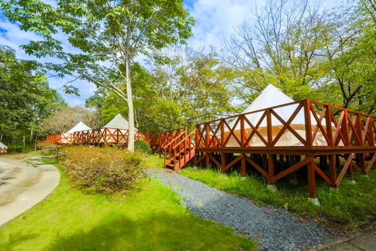 大自然の中で全長150mの森の中を駆け抜ける爽快ジップラインや、木の上のアスレチックを楽しめます。(有料コンテンツ)
