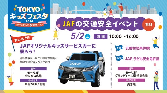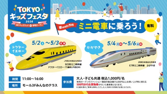 ゴールデンウィーク期間中、有明ガーデンでは、ミニ新幹線やJAFによる体験コンテンツ、ふわふわ遊具、スタンプラリーなど、ファミリーでお楽しみいただけるイベントを開催いたします。
