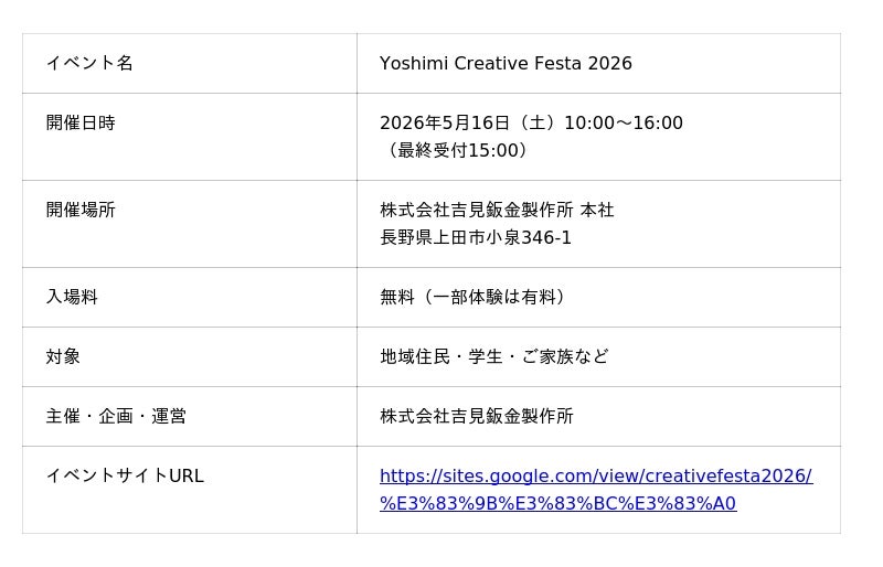 株式会社吉見鈑金製作所(本社:長野県上田市、 代表取締役:吉見 昌高)は、2026年5月16日(土)、本社工場にて体験型オープンファクトリーイベント『Yoshimi Creative Festa 2026』を開催します。