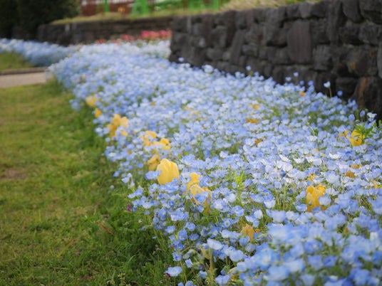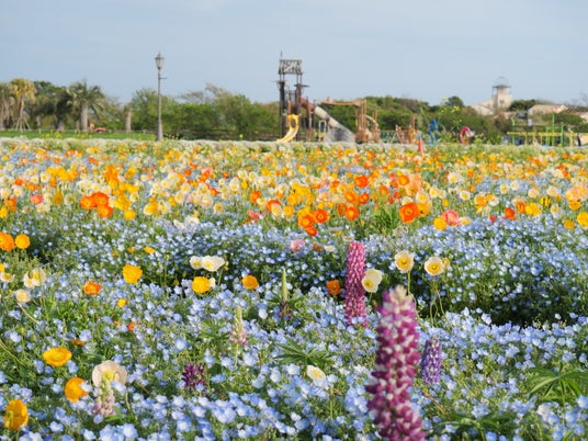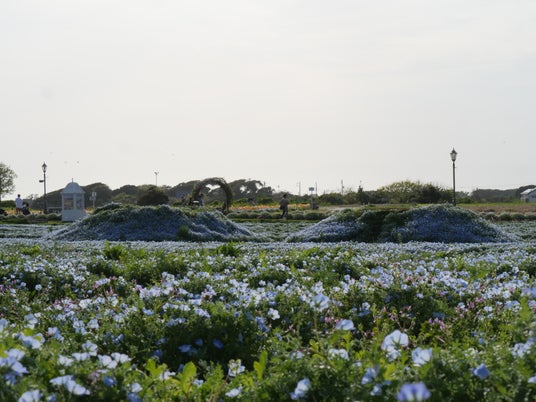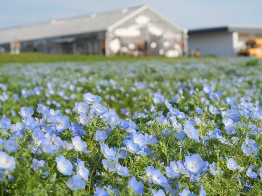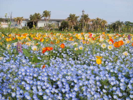 ※フラワーガーデンウエストでは、ネモフィラのほか、ポピーやチューリップなどの春の花とのミックスで開花