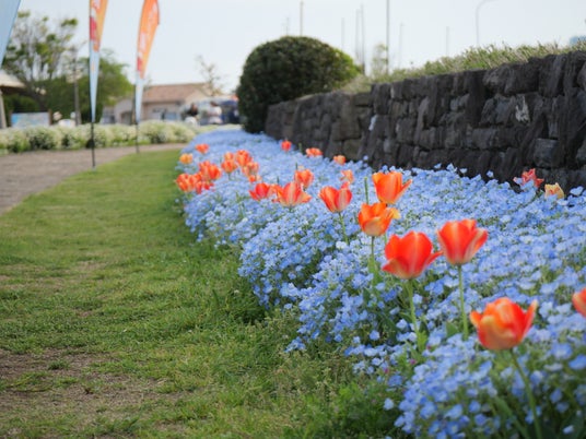 そして、フラワーガーデンウエストや園内の各所では、ネモフィラと一緒に咲き誇るカラフルな春花のポピーやチューリップも合わせて鑑賞いただけます。