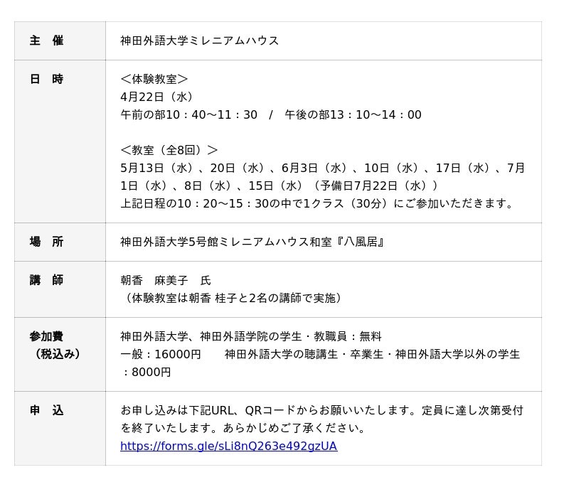 神田外語大学(千葉市美浜区/学長:芦沢 真五)は、2026年5月より、『箏の教室』『三味線と唄の教室』に加え、新たに『いけばな講座』を、伝統芸能ワークショップや公開講座、学生の発表会などが行われる学内施設、「ミレニアムハウス」にて開講します。日本の伝統文化に親しむ機会として毎年実施している本プログラムは、プロの講師による少人数制の指導のもと、初心者から経験者まで幅広く参加できる内容となっており、文化への理解と表現力の向上を目指しています。実践を通して、日本文化の奥深さや感性の豊かさを体感できる講座です。