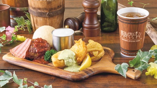 花畑のようなミモザサラダや杖を模したパンで、フリーレンの旅気分を味わえます。「ヒンメルのオムレツプレート」はチーズソースがかかった勇者の好物オムレツがメイン。ヒンメルのやさしさと勇敢さが詰まったプレートです。「アイゼン&ハイターのハンバーグとフィッシュ&チップスプレート」は頑張った者に贈られるハンバーグと、おつまみにもなるフィッシュ&チップス。アイゼンとハイターの2人が思い浮かぶ贅沢なプレートです。