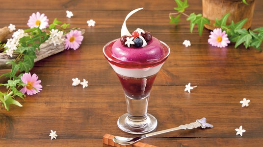 蒼月草などの花に囲まれた華やかなデザインの木製コースター付きセットもあります。「フェルンのチェリー&ブルーベリーパフェ」は、柔らかな色味のムースやゼリーをあしらいフェルンらしさを演出、魔法の軌道をイメージしたホワイトチョコがポイントです。