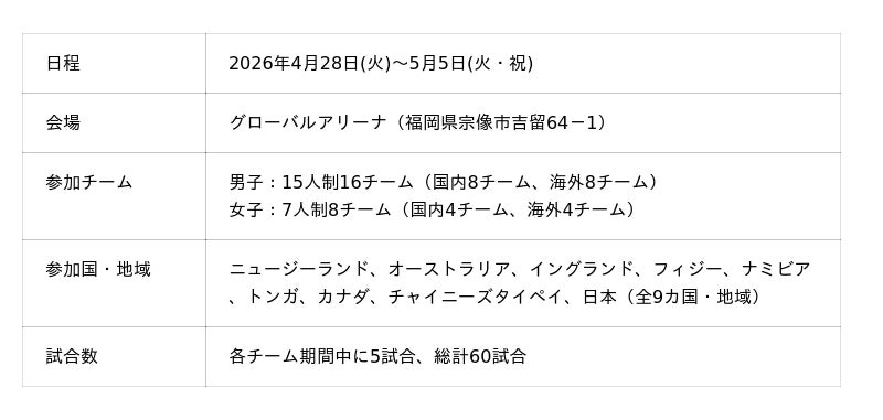 本大会は2000年の初開催以来、今年で27年目を迎えます。今年は、男子16チーム、女子8チームが福岡に集結。ラグビー王国ニュージーランドの王者をはじめ、世界各地の強豪校と日本のトップチームが激突する、高校ラグビー界最高峰の国際大会です。