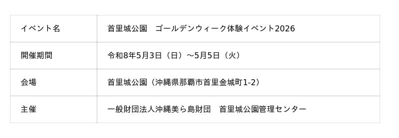 首里城公園では、令和8年5月3日(日)~5月5日(火)の3日間、「ゴールデンウィーク体験イベント2026」を開催します。琉球王国時代の伝統技法に触れる「金細工(カンゼーク)お守り作り体験」や「紅型コースター染付け体験」、昔ながらの伝統美を体験する「琉球張り子絵付け体験」。さらに、公園内を巡りながら謎解きに挑戦する「謎解きゲーム」など、親子で楽しめるイベントも多数ご用意しています。