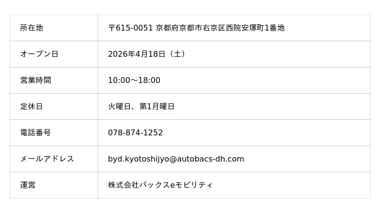 BYDの日本法人、BYD Auto Japan株式会社(本社:神奈川県横浜市、代表取締役社長:東福寺 厚樹、略称:BAJ)の正規ディーラーである株式会社バックスeモビリティ(*1)(本社:東京都練馬区、代表取締役社長:三田 真之)は、2026年4月18日(土)に、京都府初となるショールームを備えた正規ディーラー店舗「BYD AUTO 京都四条」をオープンします。