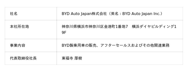 BYDの日本法人 ビーワイディージャパン株式会社の100%出資子会社として設立したBYD Auto Japanは、日本でのBYD製乗用車の販売およびサービスを専業に行う会社です。