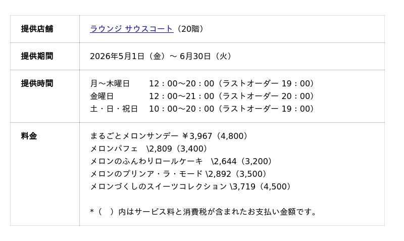 「小田急ホテルセンチュリーサザンタワー」(所在地:東京都渋谷区代々木2-2-1、総支配人:宮越 真理子)内、「ラウンジ サウスコート」(20階)では、 一口で初夏の味わいが楽しめる、果実の王様“メロン”を贅沢に使用した5種類のスイーツが揃う「メロンスイーツフェア」を2026年5月1日(金)から6月30日(火)までの期間限定で提供します。