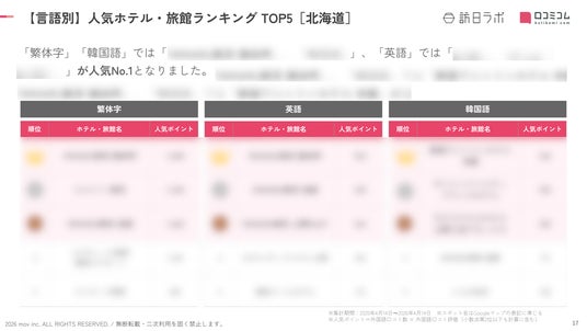 業界最大級のインバウンドビジネスメディア「訪日ラボ」及び 店舗向け集客一元化プラットフォーム「口コミコム」を運営する株式会社mov(代表取締役:渡邊 誠、本社:東京都渋谷区、以下mov)は、北海道のホテル・旅館に寄せられた最新の口コミデータから、独自の『インバウンド人気ホテル・旅館ランキング』を発表しました。