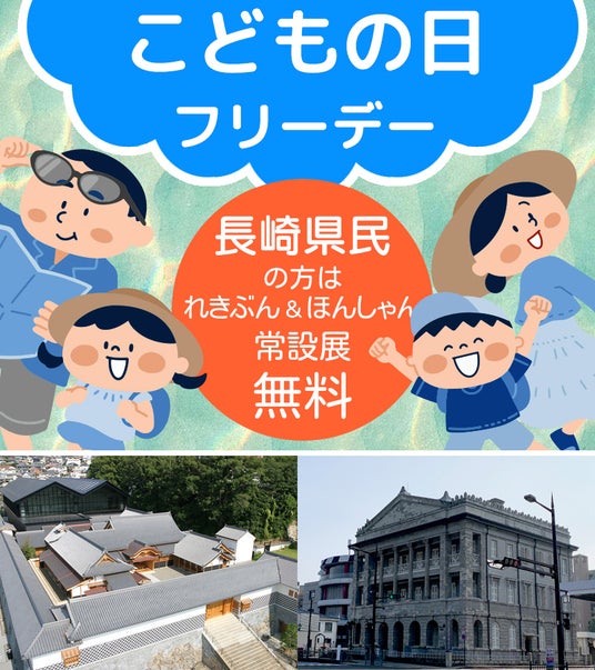 こどもの日フリーデー長崎県内在住の方は、当館の常設展(通常 大人630円、小中高生310円)と、分館の長崎市旧香港上海銀行長崎支店記念館の常設展(通常 大人410円、小中高生200円)を無料でご覧いただけます。