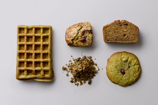 左:発酵よもぎのワッフル(フルサイズ)¥1,200 (税込)、真中上:発酵よもぎとあずきのスコーン¥530(税込)、右上:発酵よもぎのバナナブレッド¥530(税込)、真中下:発酵よもぎとデーツのグラノーラ¥1880(税込)/120g、右下:発酵よもぎクッキー¥430(税込)